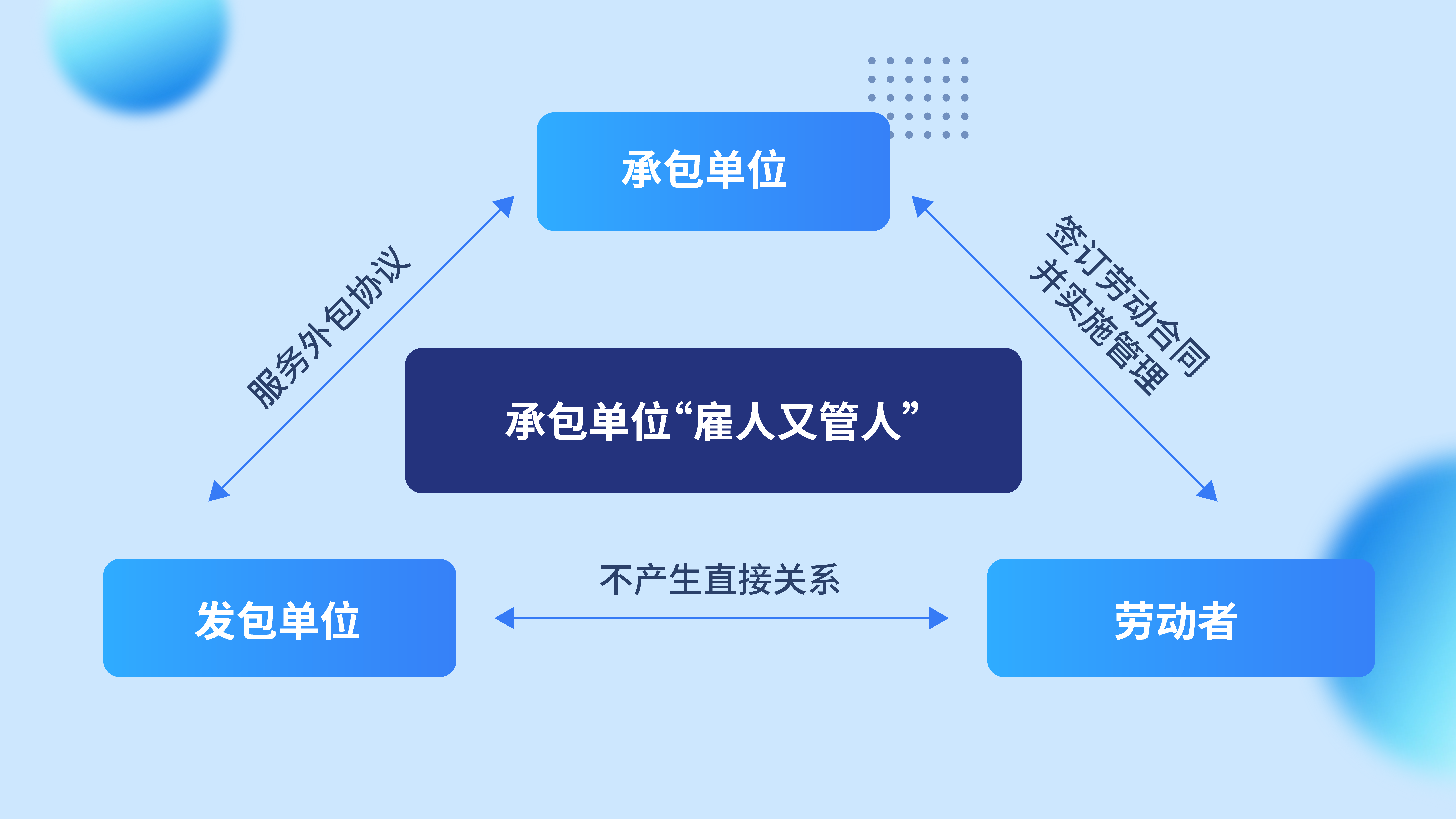 业务外包是直线关系,即发包方与承包方之间是承揽、委托等民事合同关系,承包方与具体从事外包工作的人员之间是劳动或劳务法律关系,而发包方与外包工之间不存在劳动、劳务或其他用工关系。业务外包下,发包方一般不对外包工直接管理。