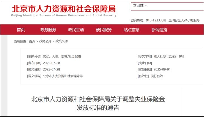 7月28日,北京市人力资源和社会保障局发布了关于调整失业保险金发放标准的通告,调整后的失业保险金发放标准自2025年9月1日起执行。