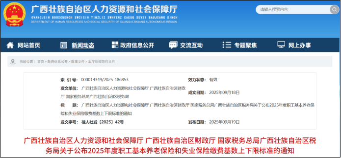 9月19日,广西发布通知公布2025年度职工基本养老保险和失业保险缴费基数。