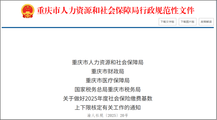 重庆市人力资源和社会保障局9月17日发布2025年度社会保险缴费基数上下限核定的通知。