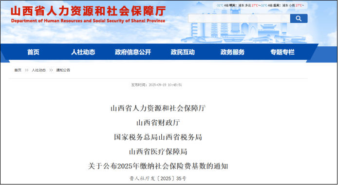 05 山西:2025年度社保缴费基数下限为4198元